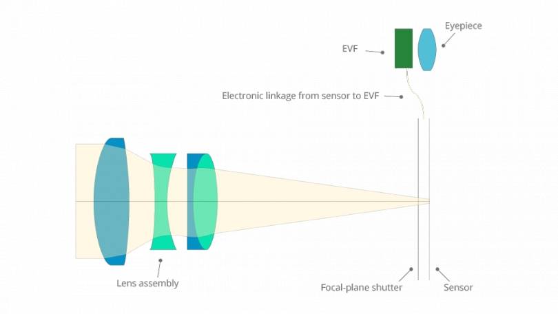 В беззеркальных камерах нет зеркала, и вместо них используется электронный видоискатель (EVF), что означает, что изображение, которое вы видите, не то, что отражается через объектив. Это электронный предварительный просмотр того, что видит ваша камера. Некоторые люди предпочитают эту систему, потому что она позволяет вам видеть изменение экспозиции в реальном времени, когда вы меняете настройки камеры, глядя в видоискатель. Когда затвор нажимается, он просто открывается, чтобы засветить датчик камеры и записать изображение.