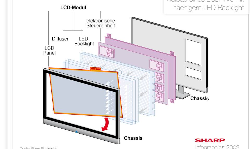 Экраны LCD и LED панелей также выполнены в формате моноблока. Представляют собой матрицу на жидких кристаллах с RGB фильтрами, размещенной между двух тонких стеклянных панелей и подсветку, интенсивность которой регулируется посредством подачи тока через специальный проводящий шлейф. Малейшая трещина внутреннего или внешнего стекла влечет повреждение соединений в кристаллической матрице, и это означает, что экран сломался.