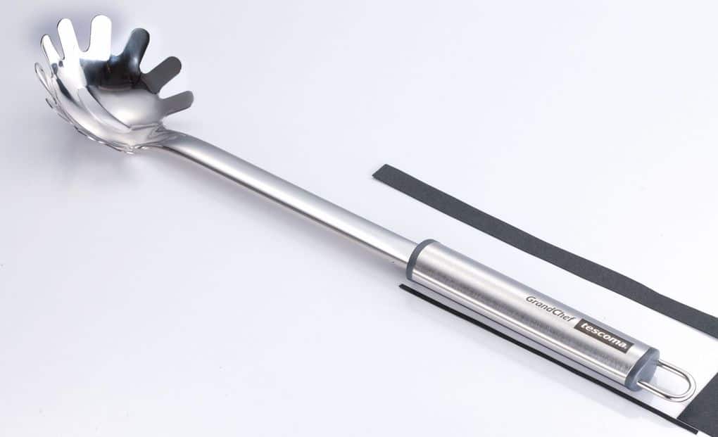 - Ложка для спагетти, необходимая для перекладывания длинной лапши и макарон из кастрюли. Как выглядит, читайте в другом нашем обзоре.