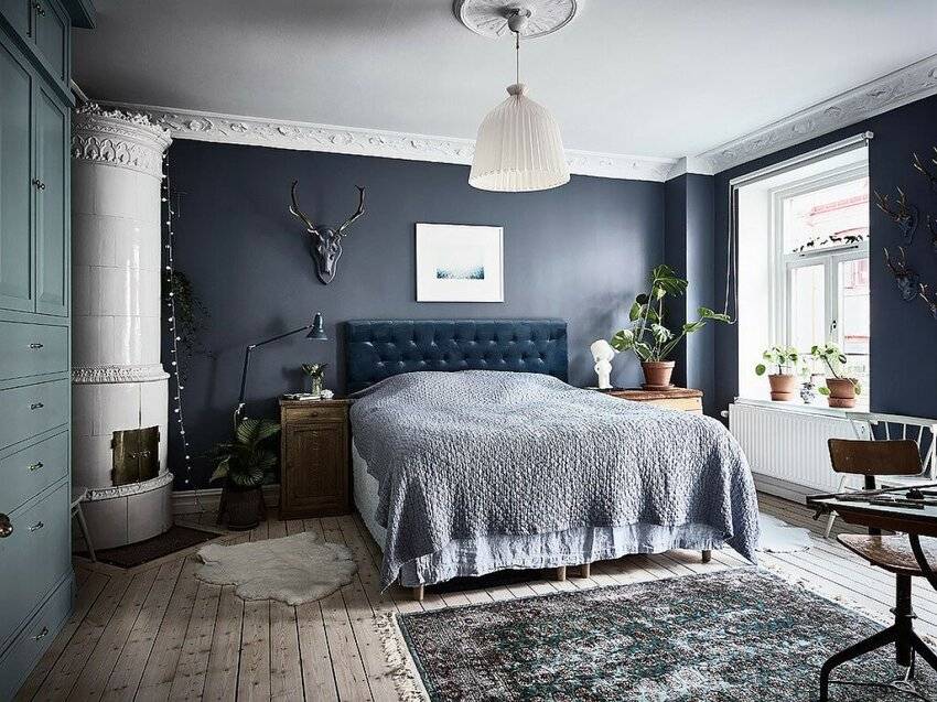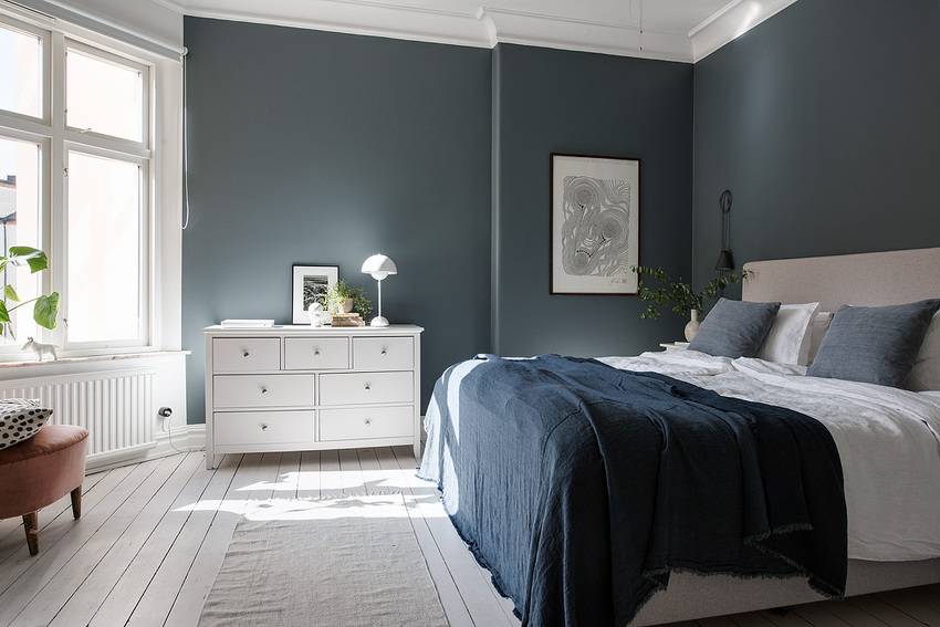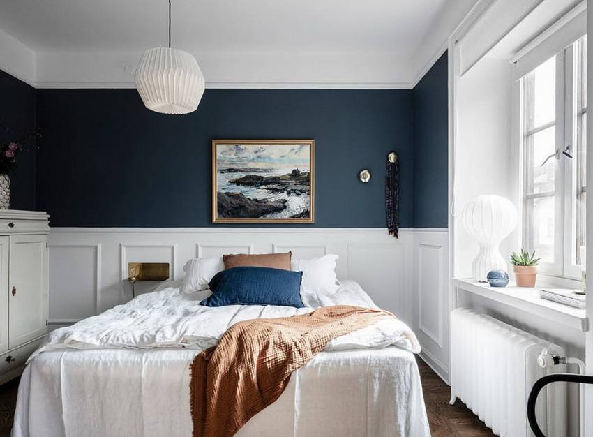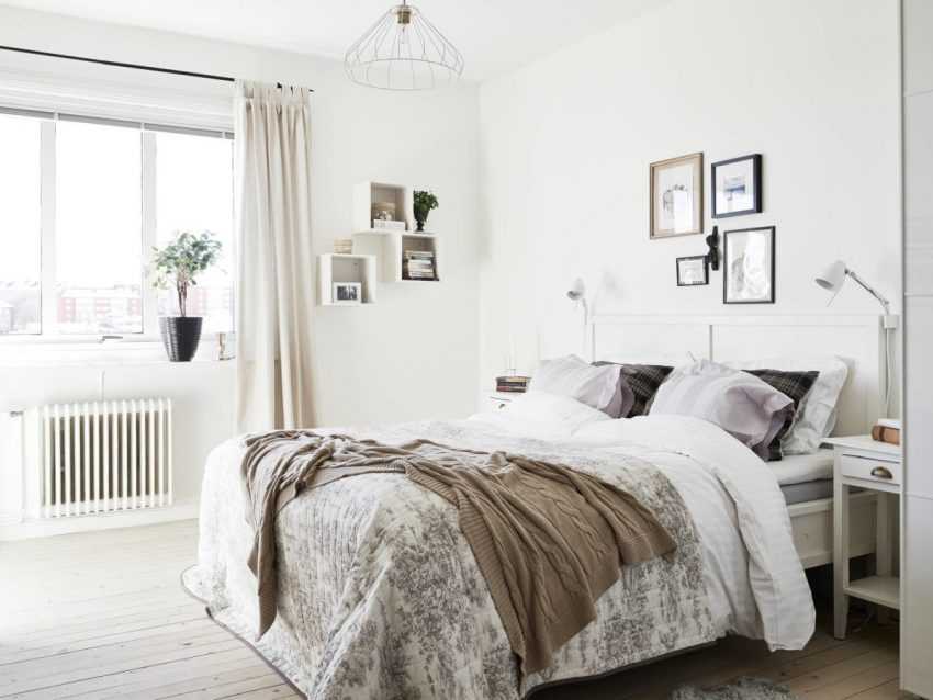 Белый цвет является традиционным для скандинавского интерьера и часто используется как базовый для покраски стен в спальне и отделки других поверхностей.
