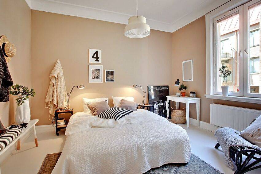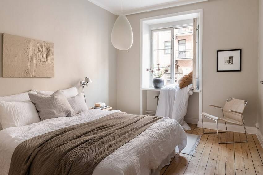 Существенным преимуществом этих цветов является их способность делать пространство шире и объемнее. В том случае, если комната не отличается большими размерами, отличным вариантом будет поклеить светлые обои или покрасить в белые или бежевые цвета стены. Особенно популярна белая спальня в скандинавском стиле.