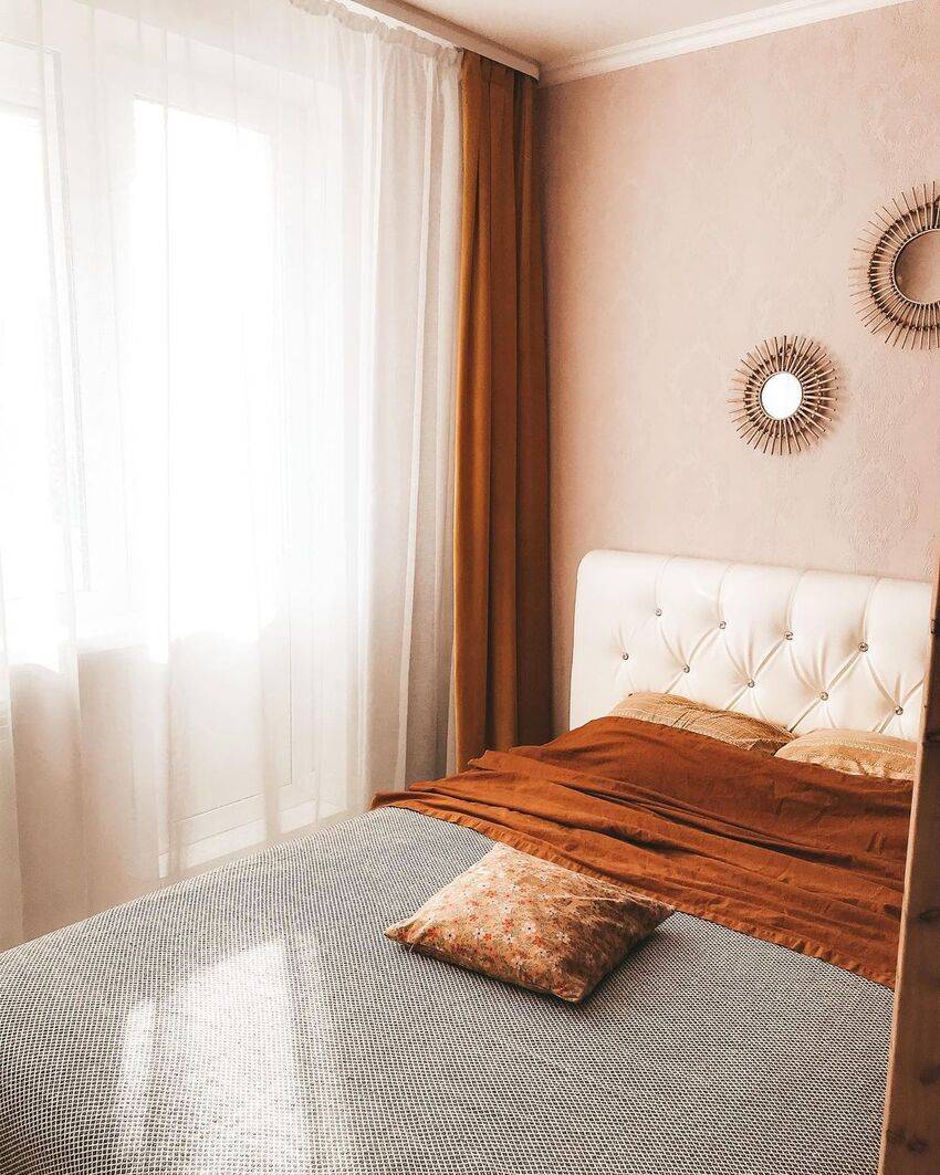 Светло-бежевые оттенки подчеркнут спокойную элегантность комнаты. Главное, не загромождать помещение тяжелой мебелью и темными занавесками.