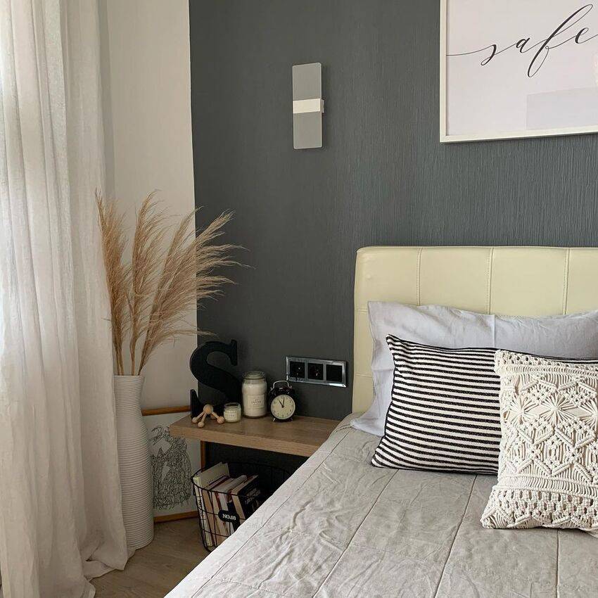 Кровать считается самым главным местом в спальне, поэтому целесообразно будет выделить ее с помощью фотообоев или рисунка. Кровать должна соответствовать цвету стен, дверей и пола. В данный период времени очень актуален черный и серый цвета. Их можно использовать при выделении зоны кровати.
