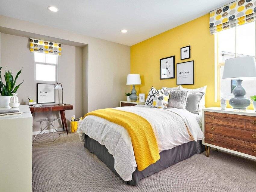 Этот яркий цвет стал использоваться в скандинавских интерьерах из-за нехватки естественного солнечного света. В спальне рекомендуется использовать теплые оттенки типа горчичного, цвета сливочного масла, банановой кожуры, кукурузный, золотистый.