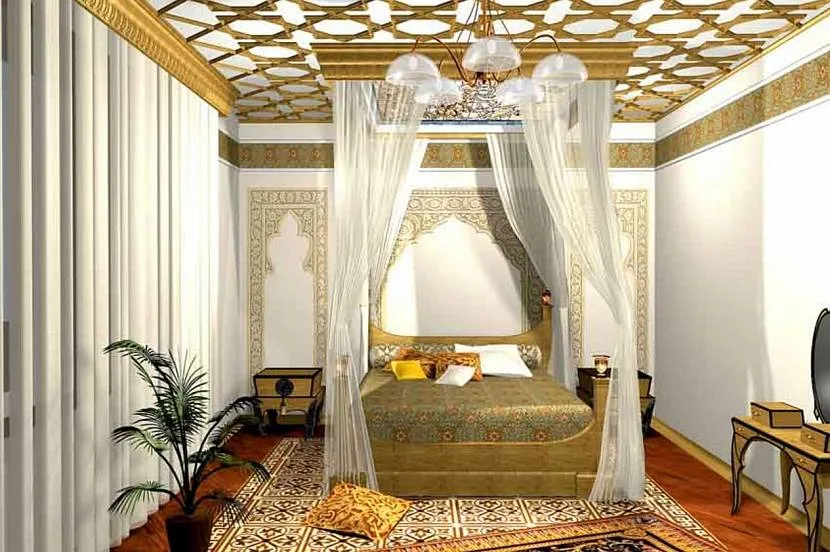 Изысканный дизайн подходит для оформления гостиной, кабинета, ванной, спальни. Декор немыслим без характерных для мусульманского региона растительных и геометрических орнаментов. Не обойтись и без разнообразного текстиля: ковров, подушек, штор из дорогих тканей.