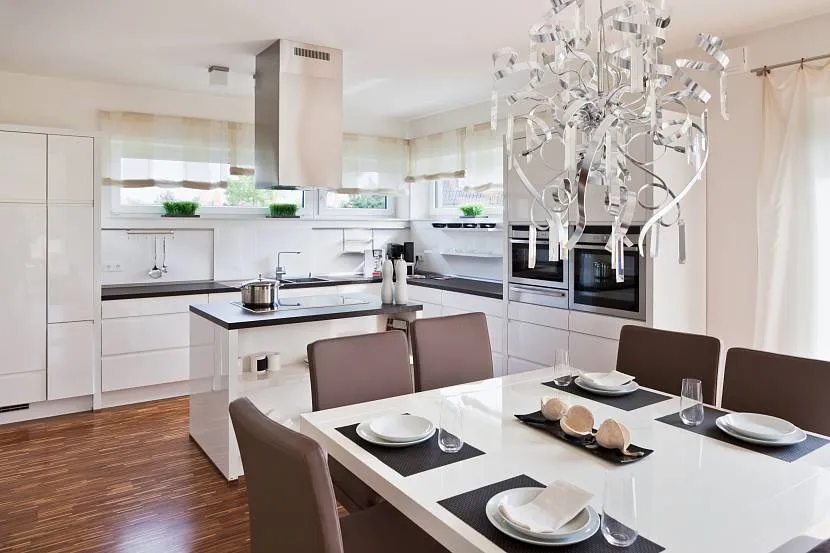Обеденной зоне лучше расположиться в самой просторной части кухни, где все члены семьи смогут чувствовать себя комфортно.