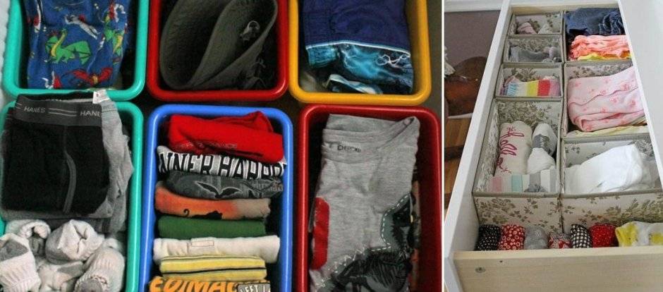 Удобно, когда ящики разделены на секции с учетом размеров хранимых вещей. Это предотвратит путаницу и облегчит все последующие уборки. Органайзеры-разделители можно купить в магазине или сделать самостоятельно с помощью картона, ДСП или фанеры.