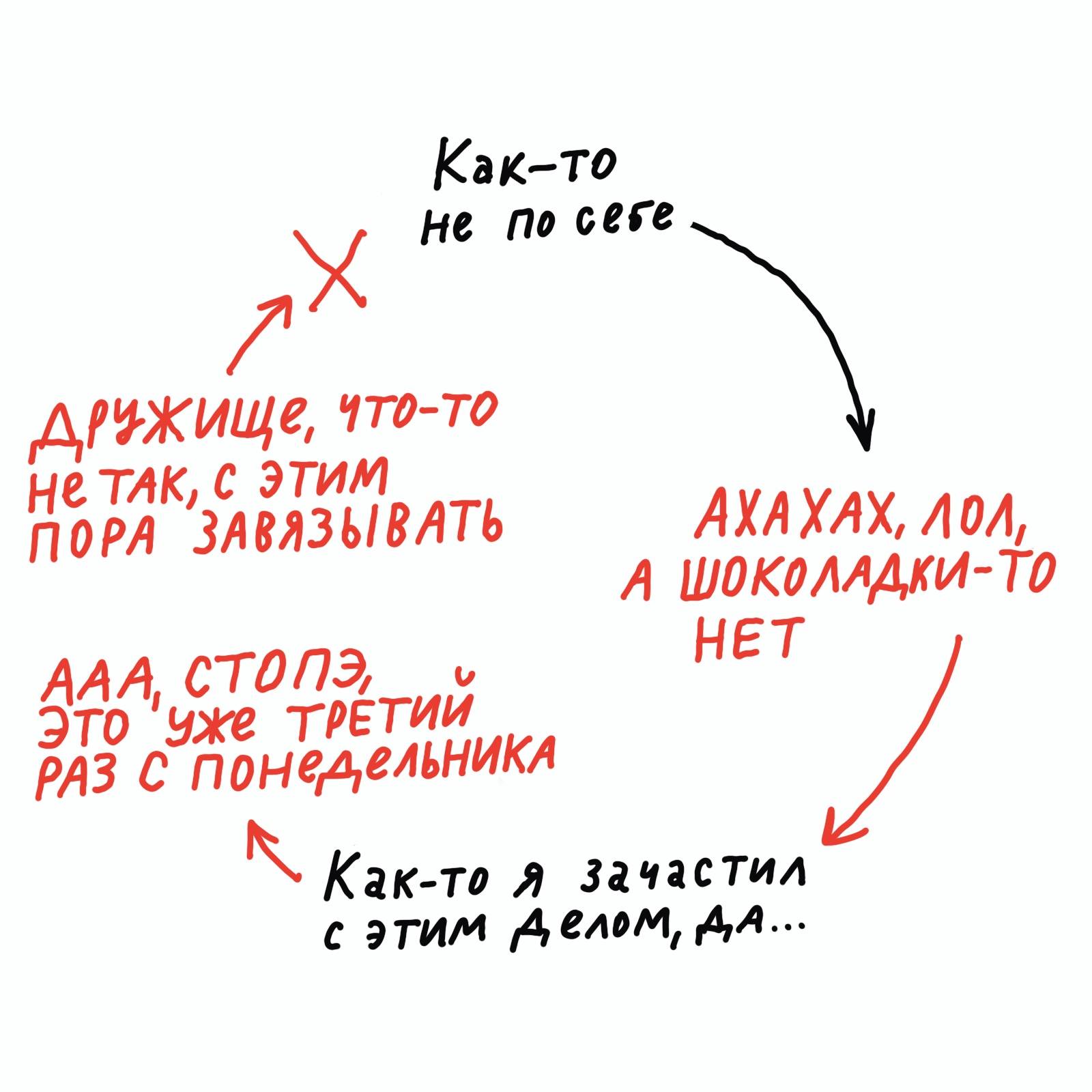 Ночная шоколадка — это же не просто душевный порыв, это организм просит подкинуть дровишек. Нельзя просто игнорировать его сигналы, он возьмёт своё. Сигаретка — это антистрессовый ритуал, и если его не провести, ты начнёшь практиковать ещё более разрушительные ритуалы. Соцсети часто нужны тогда, когда в жизни больше нет ничего интересного. Не будешь же ты смотреть в потолок. Нужно искать занятия и вещества на замену.
