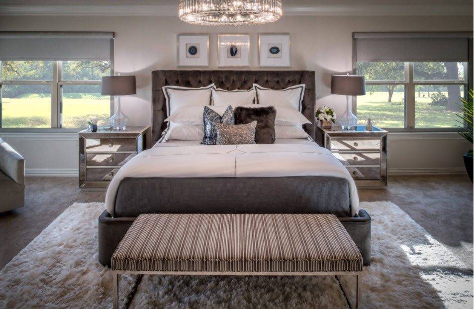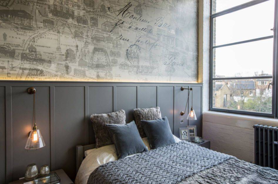 Если предпочтение падает на современную спальню, могут потребоваться более глубокие и драматические оттенки серого. Объединив их с металлом и стеклом можно получить индустриальный стиль.