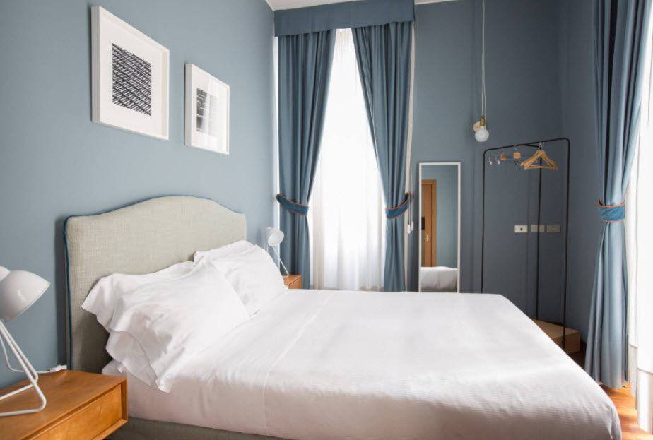 - Освежить интерьер жаркой спальни, расположенной на южной стороне позволит бежево-синяя комбинация.