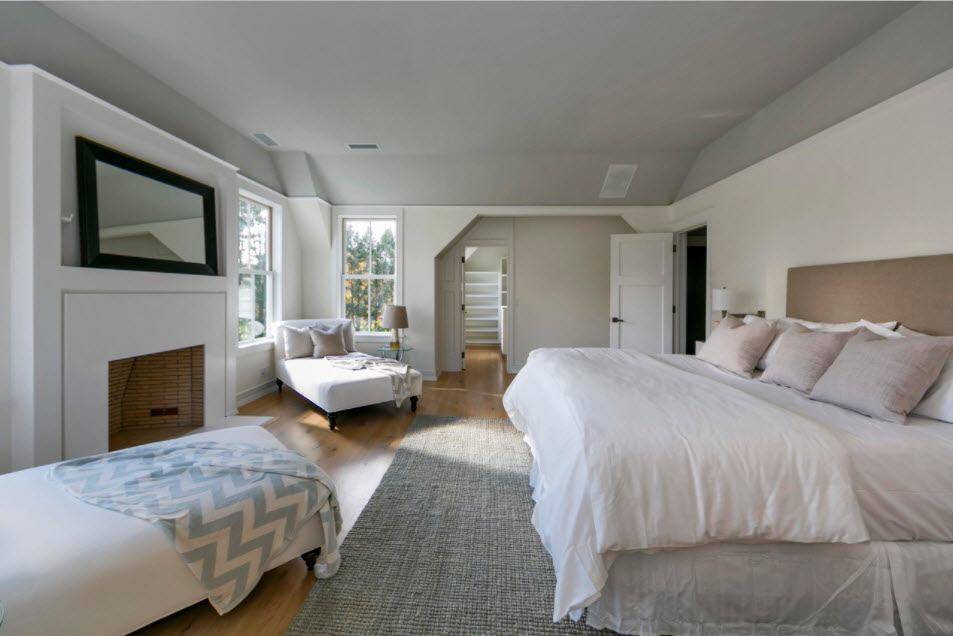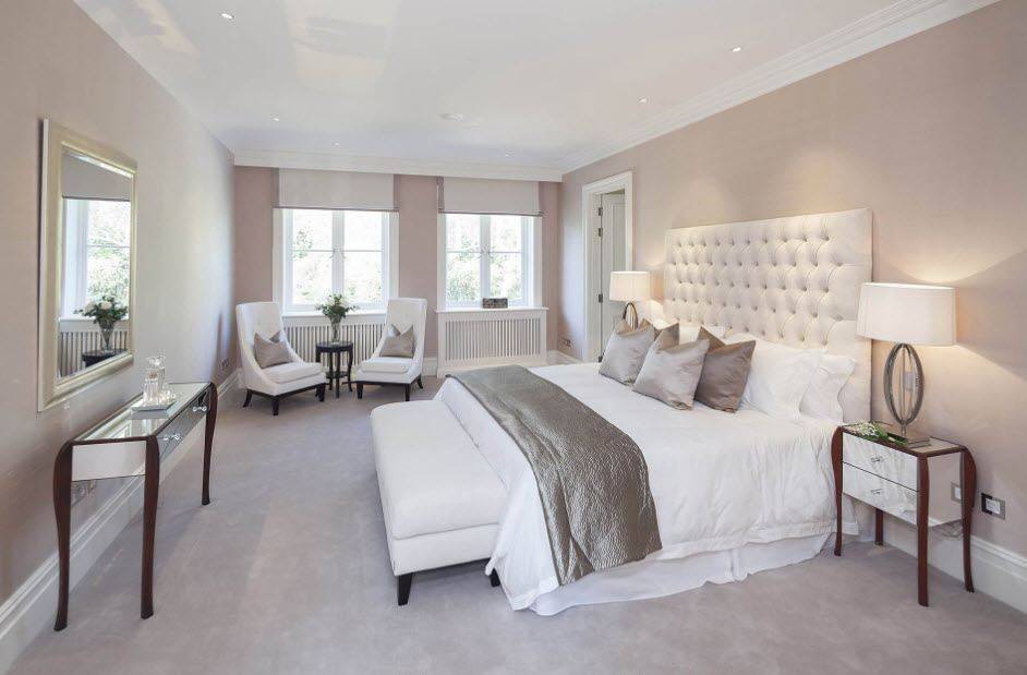 Хотя среди современных интерьеров не так много чисто белых, в твоем распоряжении остаются все оттенки бледно-серого и светло-бежевого. Тем более, их можно эффектно сочетать между собой – и спальня получится одновременно уютной и строгой. Игра теплых и холодных оттенков – очень сильный инструмент современного стиля.