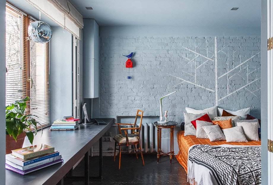 Для зонирования подходят комнаты от 14 м². При меньшей площади цветовые контрасты и перегородки будут утяжелять пространство.