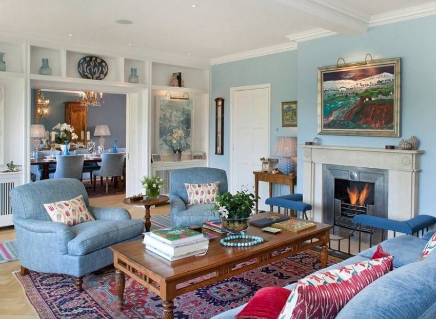 Данный цвет относится к холодной палитре, постоянно создавая ощущение морского побережья. Зрительно оттенки синего имеют чувство глубины и удаленности. А в сочетании с белым или цветом слоновой кости рождает мысли о лете и побережье моря. Часто используется для гостиных в современном стиле хай-тек, поп-арт. Но интересно смотрится и в традиционных интерьерах. Голубым цветом не рекомендуется злоупотреблять, лучше использовать его в аксессуарах.