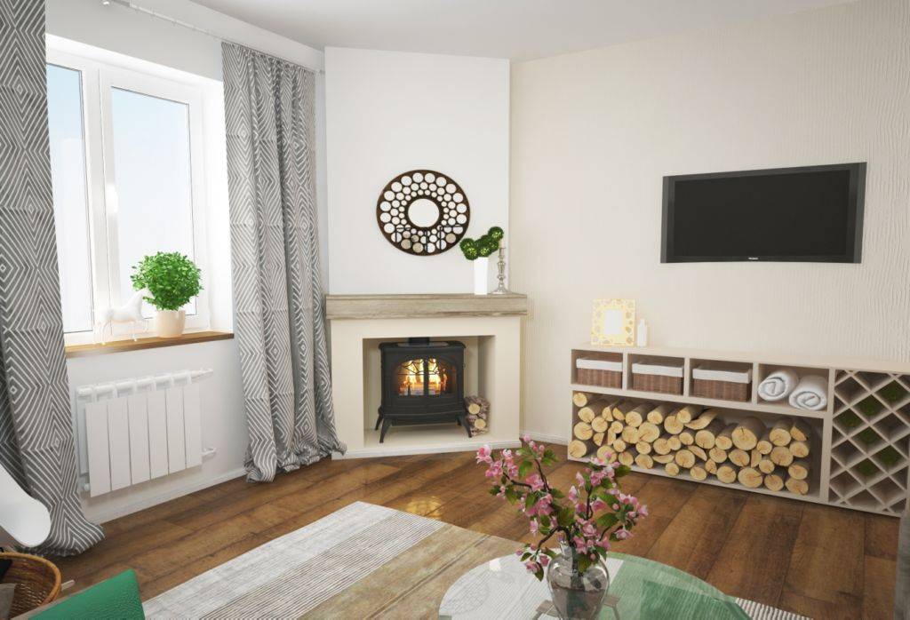 Чаще всего камин устанавливается недалеко от стены с телевизором.