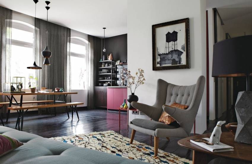 Сочетание серого с розовым можно использовать как для оформления гостиной, так и для спальни или кухни
