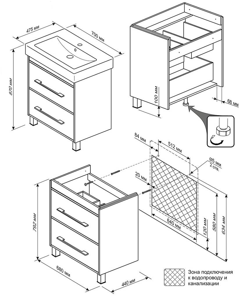 Схема монтажа тумбы под раковину