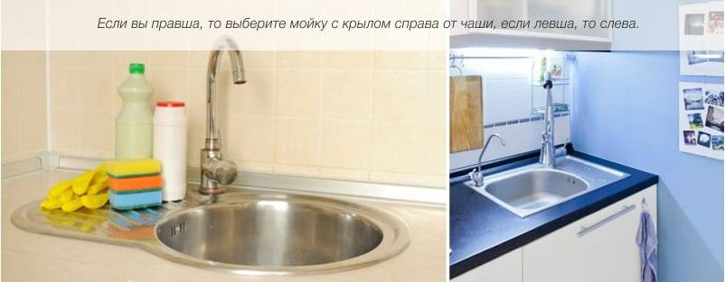 - если вы хотите купить мойку с крылом, то измерьте также длину и ширину фрагмента столешницы, которую может занять будущая мойка. При этом имейте ввиду, что если вы правша, то крыло должно быть справа, если левша, то крыло мойки лучше выбрать с левым расположением. Пример на фото ниже.
