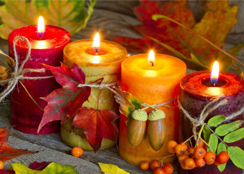 Ещё один отличный материал, с помощью которого декорируют квартиру в осеннем стиле. Тут можно использовать разные идеи, к примеру, взять банку, обклеить её разноцветными листьями и поставить в середину свечку. Таким образом мы получим необычный светильник, который можно использовать в ночное время суток.