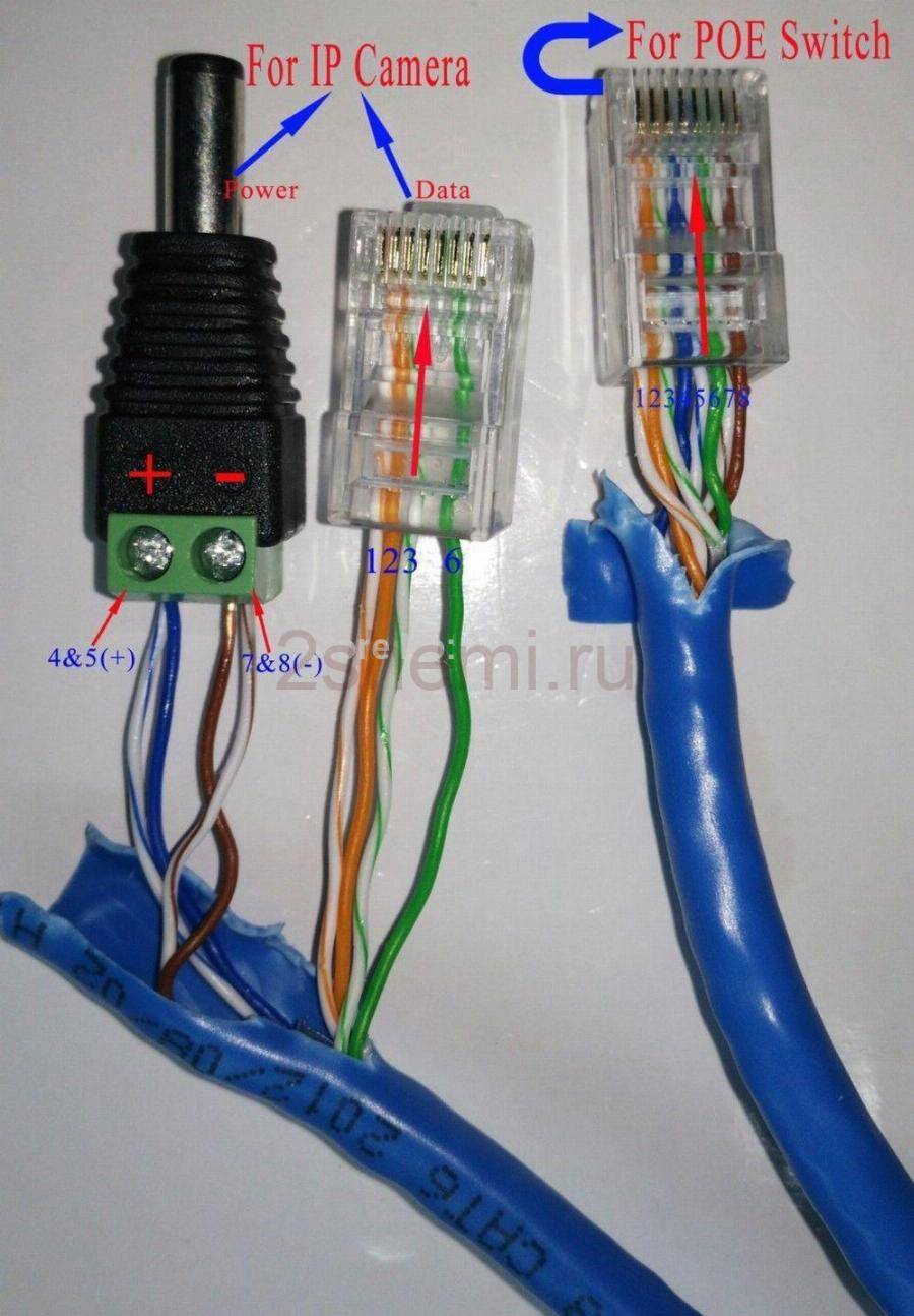 Если говорим о IP-камерах с Wi-Fi, тогда во время монтажа применяется только один кабель питания. После этого обрезает проводник до 1 сантиметра, вставляя в них, не меняя последовательность цветов, в разъем RJ45, расположив его контактной группой вверх.