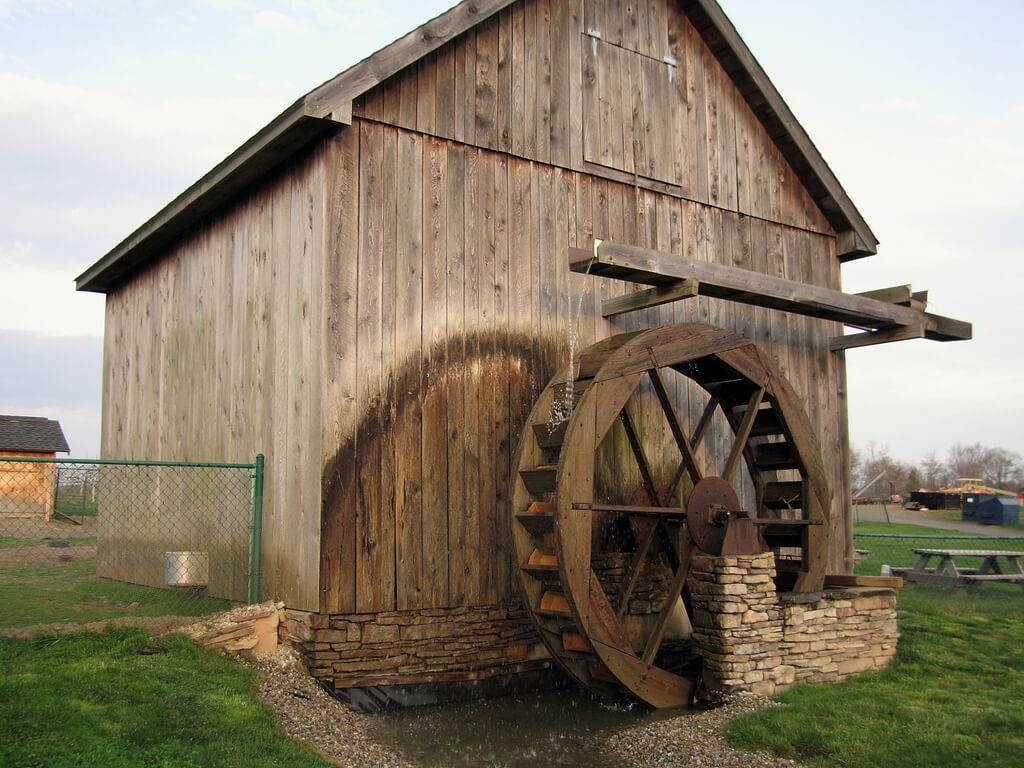 - Водяное колесо. Колесо с лопастями, частично погруженное в поток, и расположенное под прямым углом к поверхности воды. Поток воды давит на лопасти, вращая колесо.