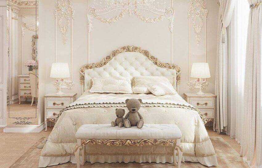 Словно королевские апартаменты выглядит просторная спальня в нежных тонах на фото