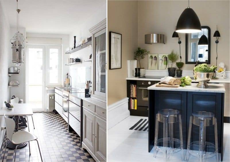 Понятно, что согласно этим пунктам, для небольших кухонь выгоднее светлая гамма и светлые «компаньоны» либо сочетание темных и светлых тонов (фото выше), но вы можете пойти еще дальше и создать выигрышные оптические иллюзии.