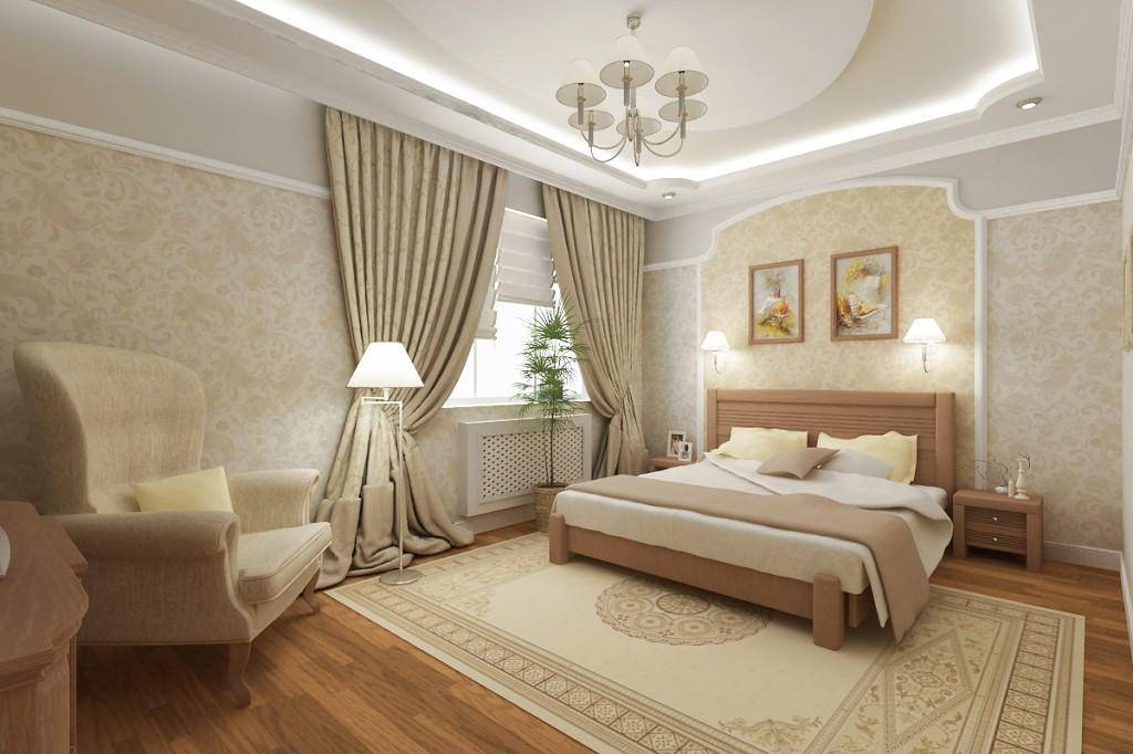 Выбор последнего варианта довольно удачен в условиях однотонных бежевых спален, так как с его помощью можно устранить имеющиеся недостатки поверхностей при помощи оформления многоуровневого дизайна. Таким образом происходит разграничение зон в просторных комнатах.