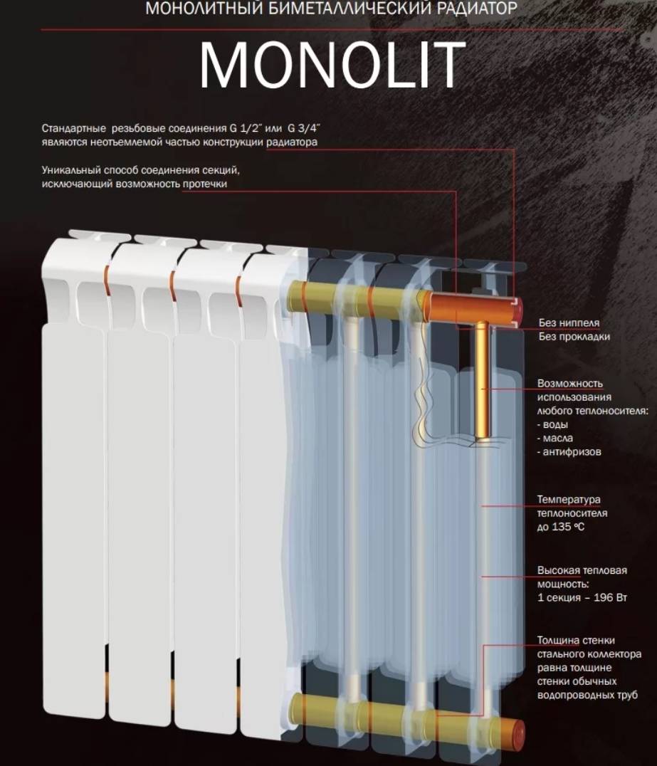 Биметаллические модели секционного типа рекомендуют устанавливать в квартирах новых многоэтажек. Нетребовательные к качеству теплоносителя устройства легко монтировать. Для старых строений отдают предпочтение монолитным вариантам. За счет усиленной конструкции батареи выдержат максимальную нагрузку, не лопнут от мощного гидроудара. От протечек отопительное оборудование защищено цельной стальной сердцевиной.