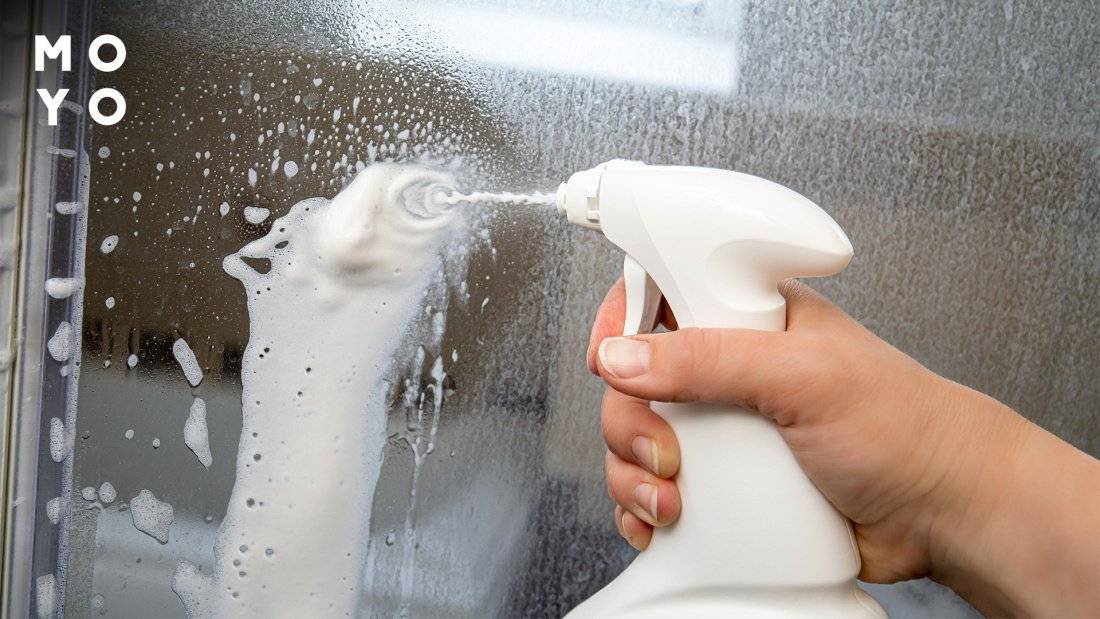 Состояние стекол – первое, что замечают при посещении ванной комнаты, поэтому стоит уделить им особое внимание. Для чистки подойдут покупные средства (Clin, Meine Liebe), достаточно просто распылить их по поверхности и оставить на указанный на упаковке срок, а затем смыть