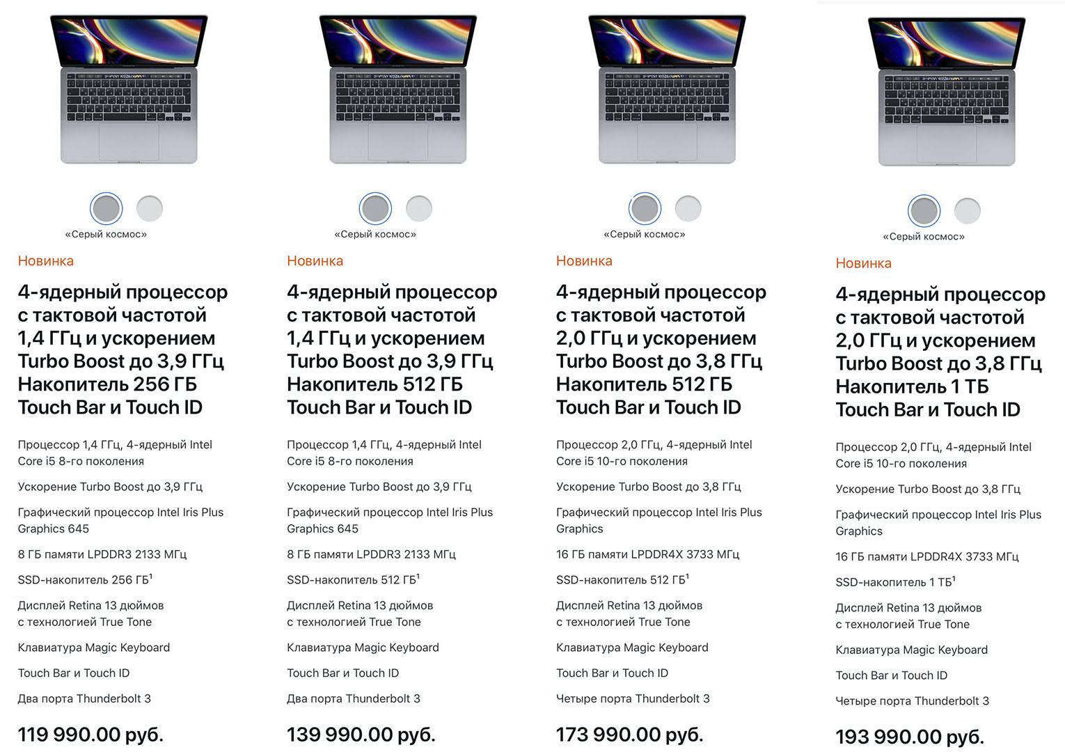 В России пока нет модификаций MacBook Pro 13 с новыми Intel Core i7, 32 ГБ памяти и SSD невероятных объёмов на 2 и 4 ТБ. Всё-таки это нишевые версии для любителей, которых у нас не так много.
