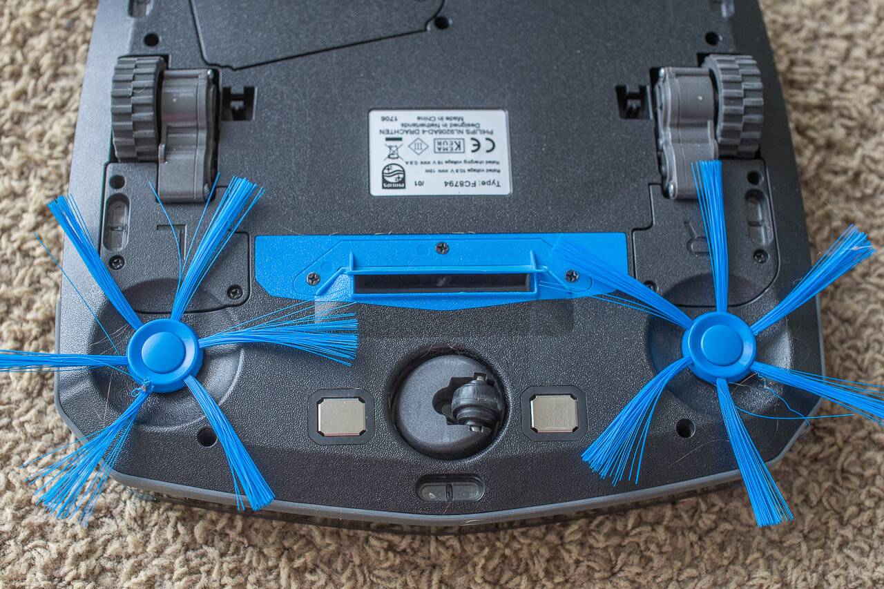 Две щетки, установленные спереди по краям, отлично справляются со своей задачей – загоняют пыль под корпус. Материал изготовления прочный, почти не изнашивается. После влажной уборки щетки моют под проточной водой