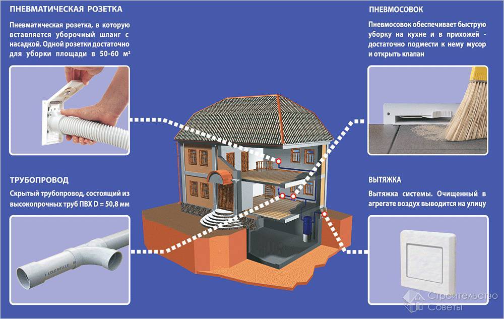Встроенный пылесос для дома представляет собой систему, состоящую из центрального блока, воздухоотводов, пневморозеток и шланга с насадками. Центральный блок имеет такое же строение, как и обычный агрегат: вентилятор, очень мощный двигатель, фильтр-сепаратор, дополнительные фильтры тонкой очистки и автоматика. Основной блок размещают в любых подсобных помещениях, где нет повышенной влажности воздуха. Воздухоотводы — это трубы диаметром 50-100 мм, имеющие специальное покрытие внутренней поверхности, которое препятствует образованию статического напряжения и залипание на них мусора. Сетка труб устанавливается внутри стен, полов, потолков. К воздухоотводам присоединяют длинный гофрированный шланг через пневморозетки. Собственно пневморозетки это единственная бросающаяся в глаза часть встроенного пылесоса в квартире. Производители учли этот момент и выпускают пневморозетки с таким дизайном, который легко вписать в любой инреръер. Кнопки управления пылесосом расположены на рукоятке, присоединенной к шлангу. Грязь засасывается в трубопровод и переносится в центральный приемник, далее использованный воздух через клапан выбрасывается в систему вентиляции или наружу. Особенности конструкции обуславливают преимущества центрального пылесоса. Это в первую очередь лучшее качество очистки помещения, ведь встроенный пылесос не возвращает отработанный воздух в помещение. Они менее шумные, имеют на много более вместительный пылесборник, вместо тяжелого аппарата по комнатам приходится перемещать только легкий шланг. Необходимо отметить, что наружные шланги достаточно длинные, чтоб убрать большое помещение, а в совсем большом помещении можно установить несколько пневморозеток и только переключать шланг.