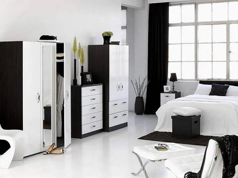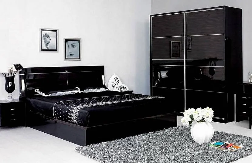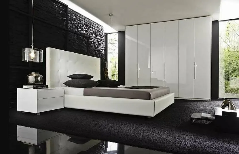 Много предметов интерьера перегружают пространство комнаты. Чтобы двухцветный дизайн выглядел уютным, используют минимум компонентов. Для спальни в черных тонах подходит белая мебель. Фасады шкафов, тумбочки и кровать станут ярким акцентом в оформлении. Игра матовых и глянцевых поверхностей поможет привнести настроение в помещение.