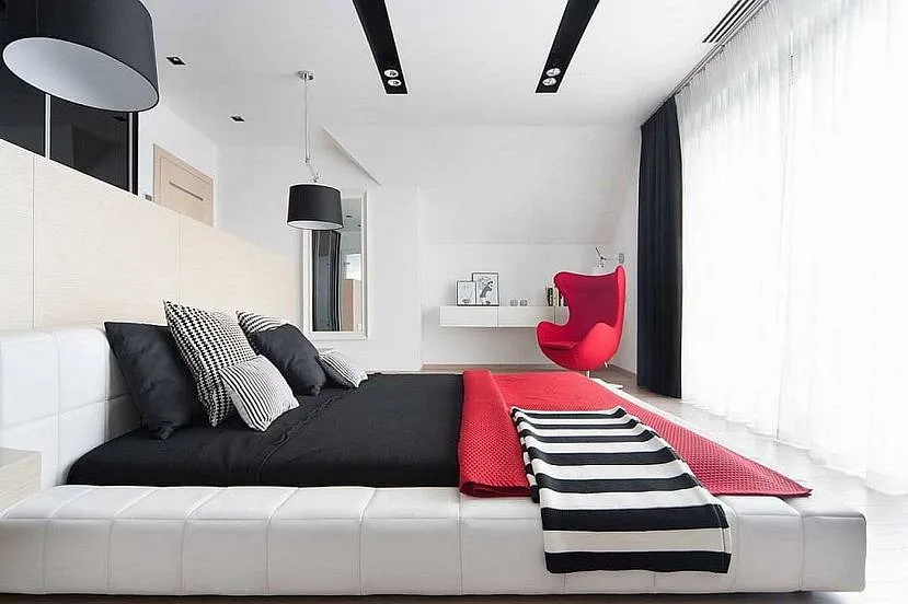Черно-белую комнату можно дополнить другими цветами. Он может быть синим, красным или зеленым. Но не стоит перенасыщать комнату этими оттенками. Таким образом, идея использования двух цветов не будет использоваться, как предполагалось ранее.