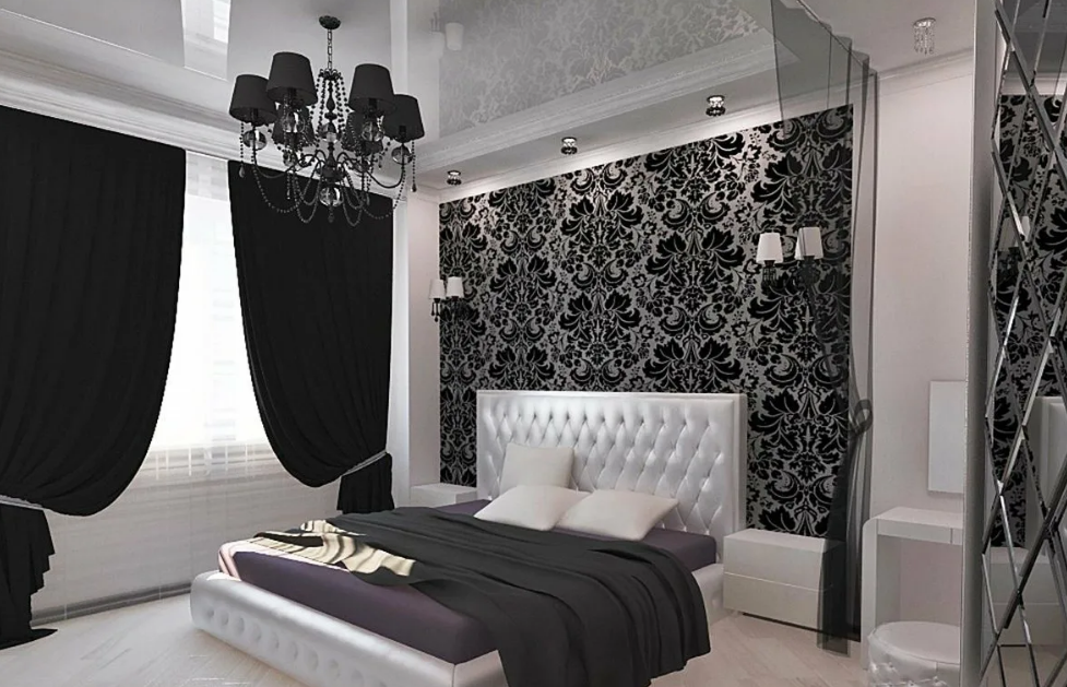 Черные обои привлекают внимание и придают комнате определенную атмосферу. Если же поклеить обои с черно-белым рисунком, то удастся взять лучшее от обоих цветов