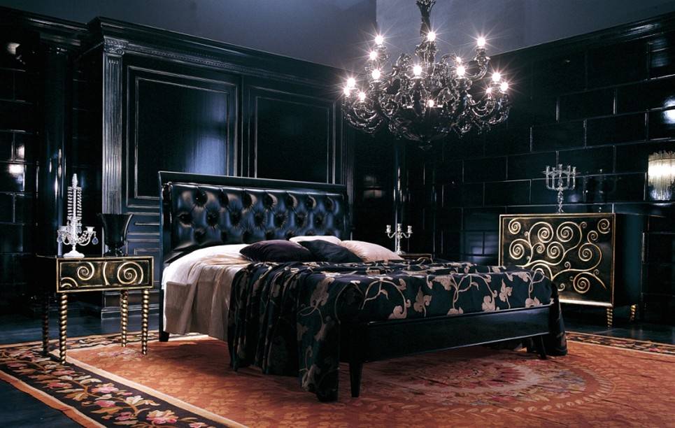 К чёрному цвету чаще всего прибегают, когда хотят создать спальню в гламурном стиле. В таком интерьере он соседствует с оттенками фиолетового, красного и блеском металлических поверхностей.