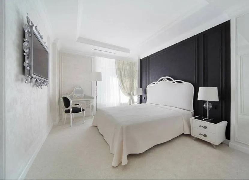 Если нравится минимализм, то есть полная свобода выбора дополнительного цвета для оформления спальной комнаты. Сочетание белого с серым или черным придаст дизайну элегантный характер.