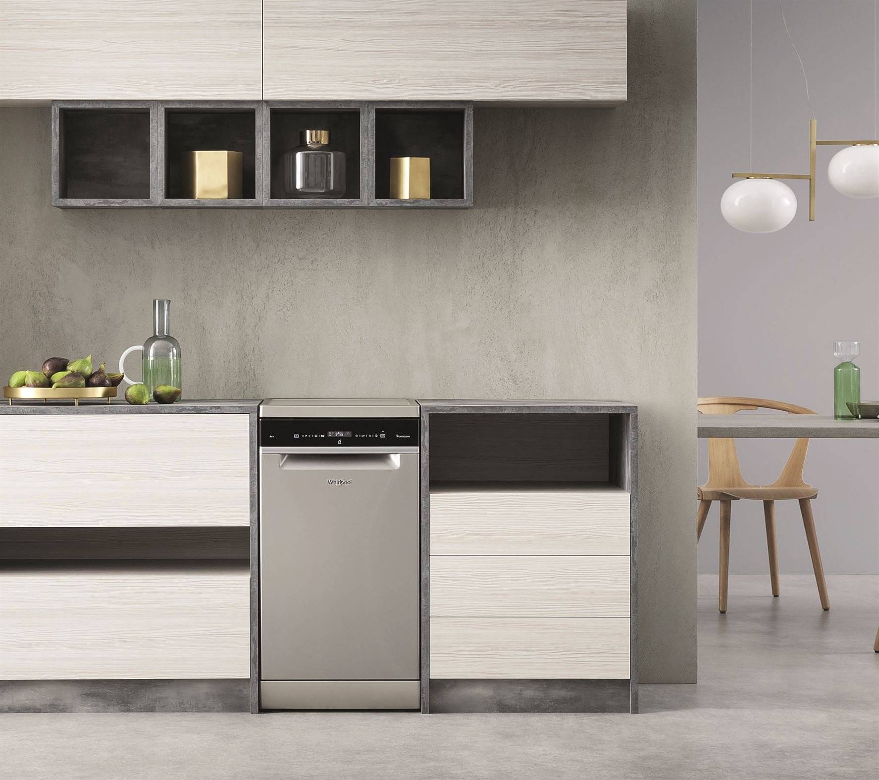 Отдельностоящая посудомойка имеет такие же качественные свойства, как и встраиваемая, но она не нуждается в обязательной установке под столешницу, хотя такая возможность есть. Также отдельностоящий тип обладает собственным фасадом, дизайном и цветом дверцы, фальш-панель устанавливать не требуется.