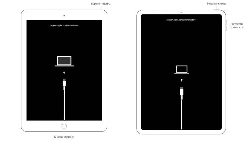 - На iPad с кнопкой «Домой» — нажмите и удерживайте боковую или верхнюю кнопку до появления ползунка «Выключите». Выключите устройство, зажмите кнопку «Домой», подключите к компьютеру через кабель. После этого удерживайте кнопку «Домой» до появления экрана режима восстановления.