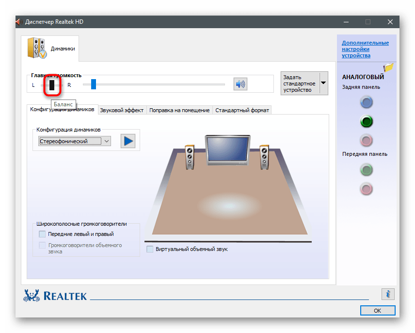 Начинать с решения аппаратных проблем наушников — не совсем рациональный подход, поскольку существует вероятность того, что в самой операционной системе выставлены неправильные настройки и их исправление сэкономит много времени. В первую очередь необходимо проверить баланс — для левого и правого наушника он был одинаковым. Сделать это можно через тот же самый Диспетчер звука, о котором уже шла речь выше.