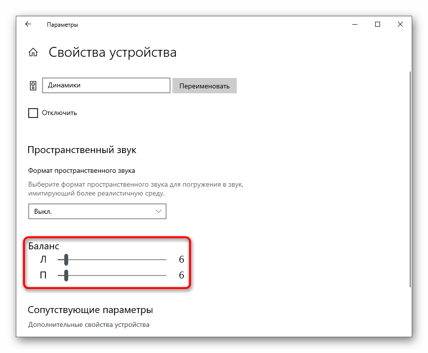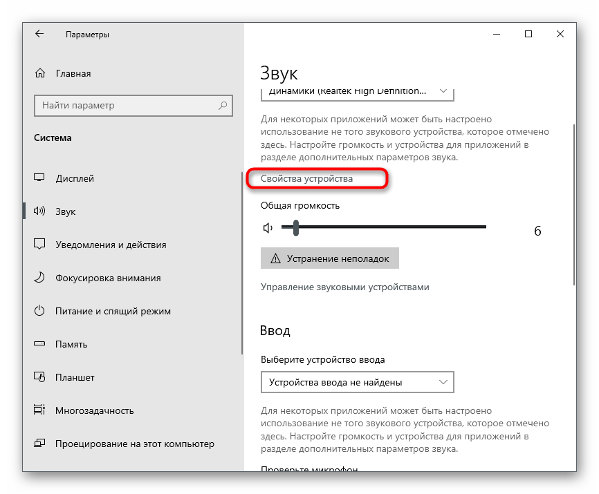 Найдите строку «Свойства устройства» под описанием используемого динамика и нажмите по ней.