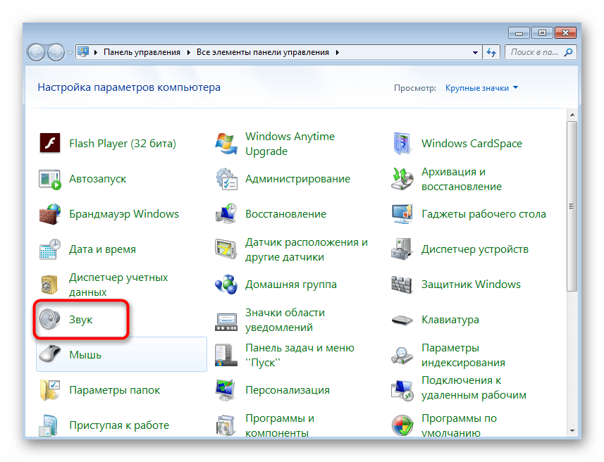- Открыть окно «Звук». Путь: Пуск → Панель управления → Звук.