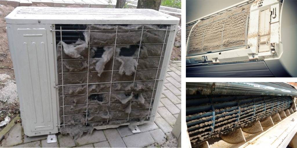 Кондиционер требует периодической чистки потому что работая он прогоняет через себя огромные объемы воздуха далеко не самого чистого. Воздух внутри помещения содержит пыль, волоски, шерсть домашних животных. Наружный воздух часто содержит тополиных пух, который быстро засоряет теплообменник наружного блока.