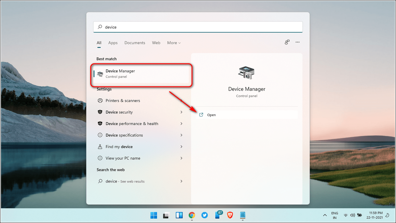 Нажмите клавишу Windows, найдите Диспетчер устройств и откройте его.