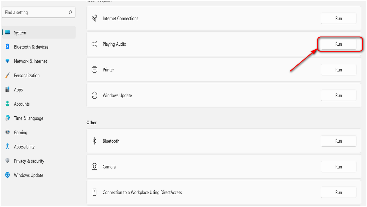 - Чтобы обнаружить и исправить проблемы, связанные со звуком, нажмите кнопку «Выполнить» перед «Воспроизведение звука», чтобы запустить соответствующее средство устранения неполадок.