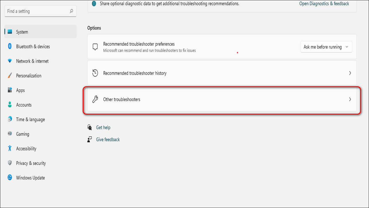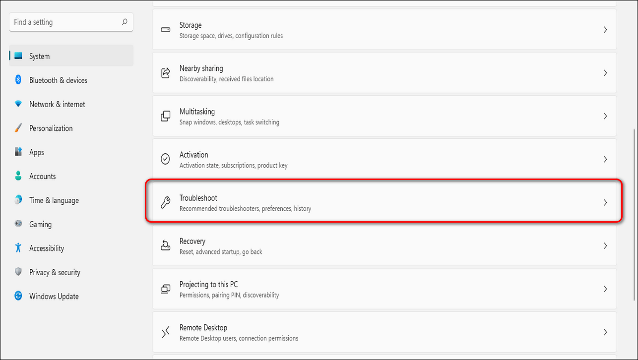На правой панели прокрутите вниз, найдите Устранение неполадок и откройте его.