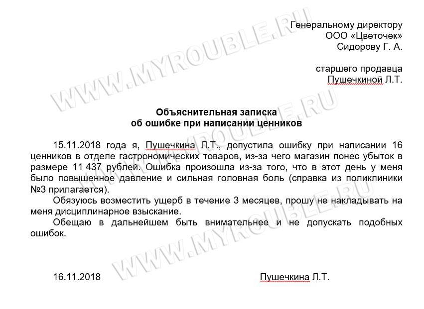 Образец объяснительной записки на работу об ошибках