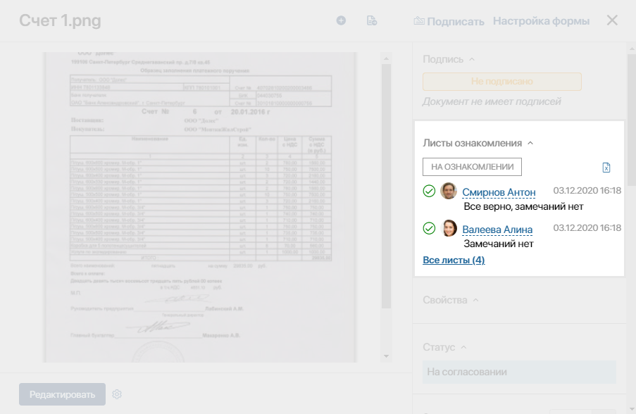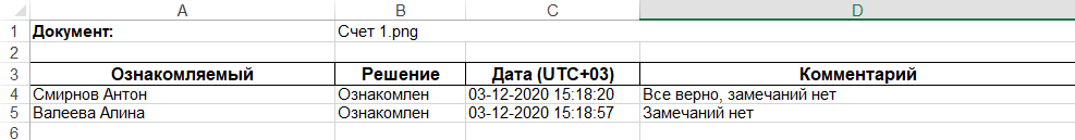 В дальнейшем выгруженный лист можно распечатать и, например, приложить к бумажной копии документа. В листе приводится название документа, перечислены ознакомленные их и решения, указаны даты принятия решения и их комментарии.