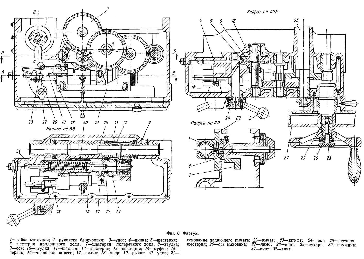За корпусом фартука находятся механизмы, связывающие суппорт с зубчатой рейкой и ходовым винтом. Управление фартуком вынесено на корпус станка, что упрощает регулировку хода суппорта.
