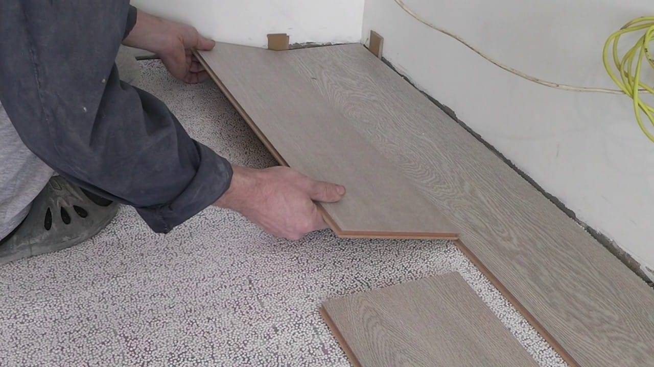 Плиты необходимо вынуть из упаковки и на некоторое время оставить их в покое, что даст им возможность распрямиться полностью. Первые ламели укладывают в углу помещения, отступая от стены на шесть миллиметров. У стены располагается та сторона материала, с которой срезана клейкая лента. Противоположная его сторона направляется к следующему ряду. Новый ряд необходимо начинать укладывать с плитки, длина которой на одну треть меньше предыдущего. Укладка следующих рядов ведется внахлест.